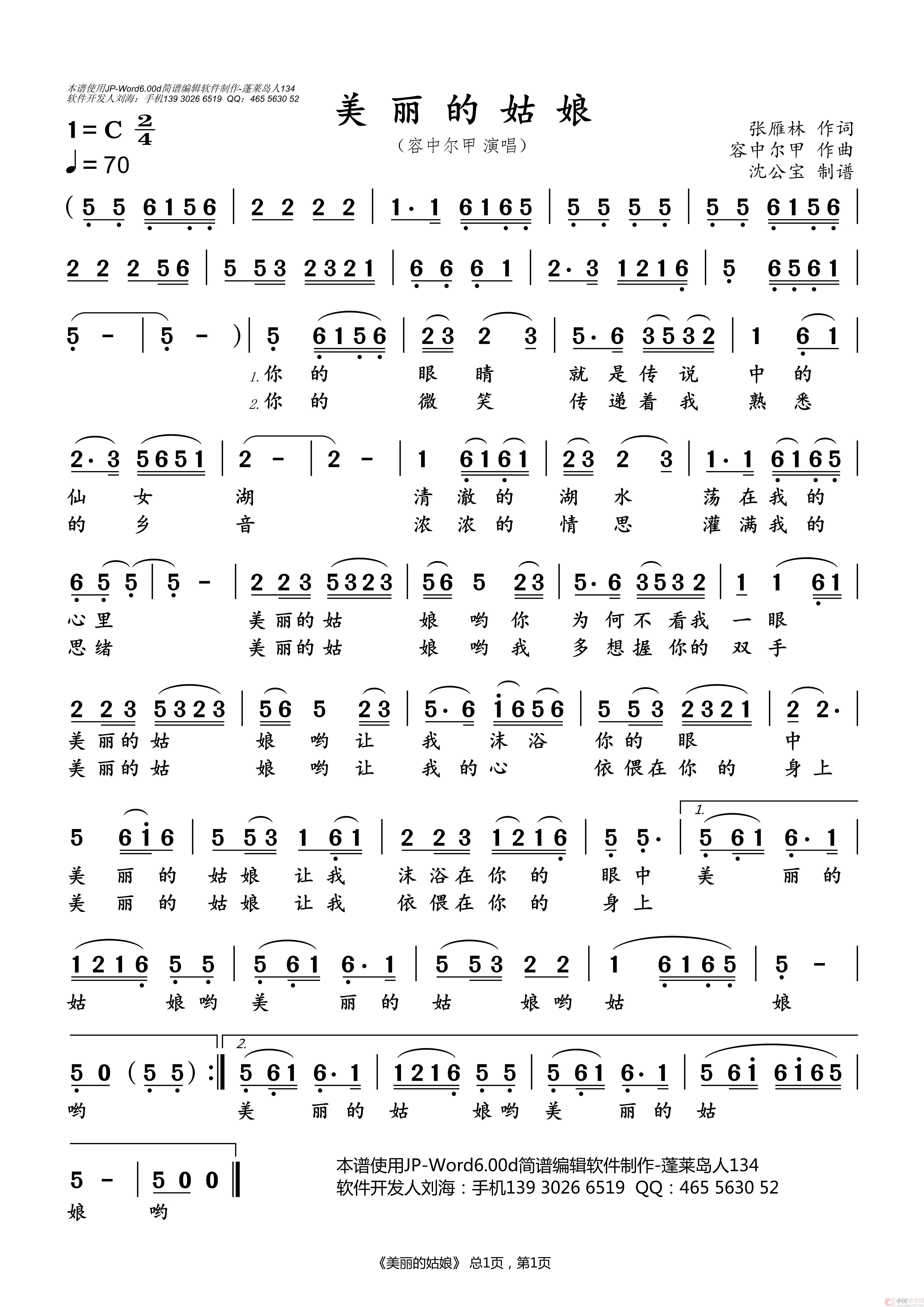 关于《美丽的姑娘》曲谱的评论