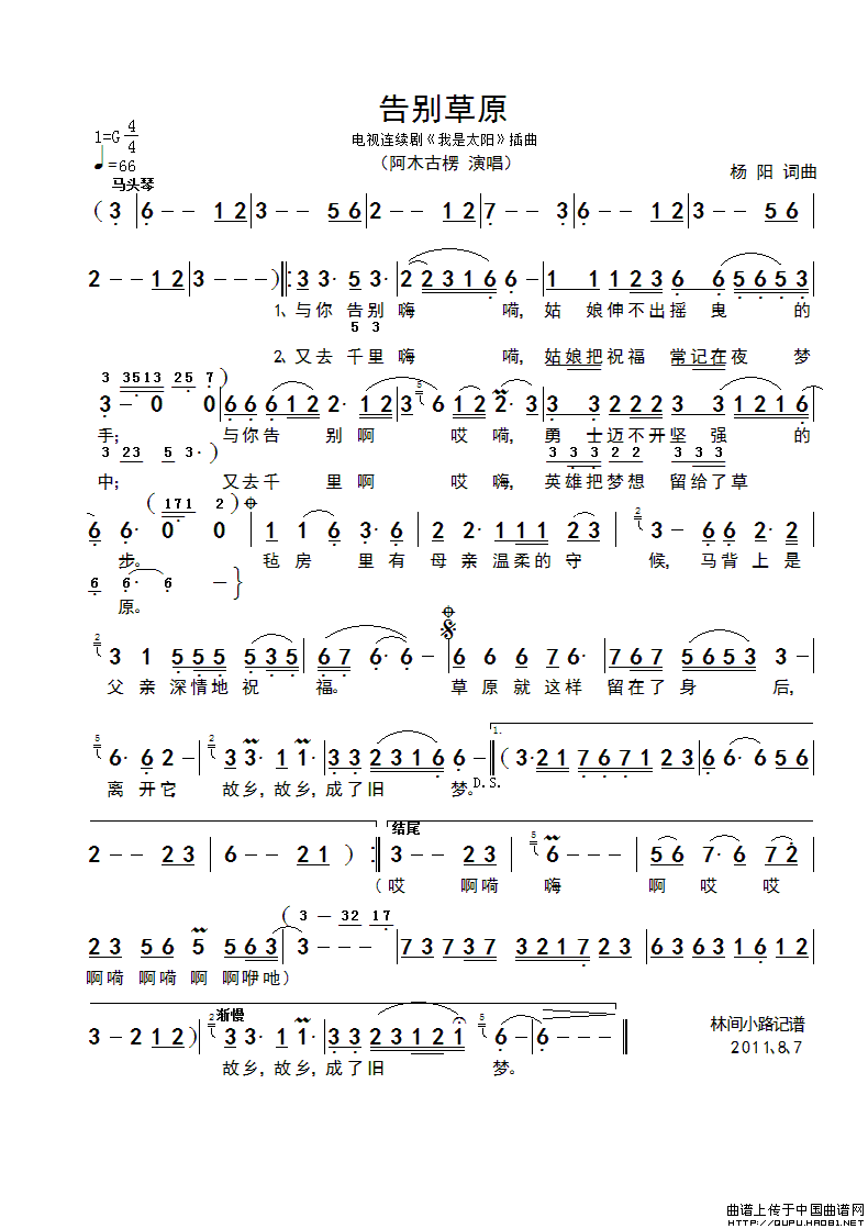 作词:杨阳   作曲:杨阳   演唱(奏):阿木古愣   格式:简谱   来源:林间小路 记谱   上传:~金沙浪~   日期:2011-11-17   浏览次数:
