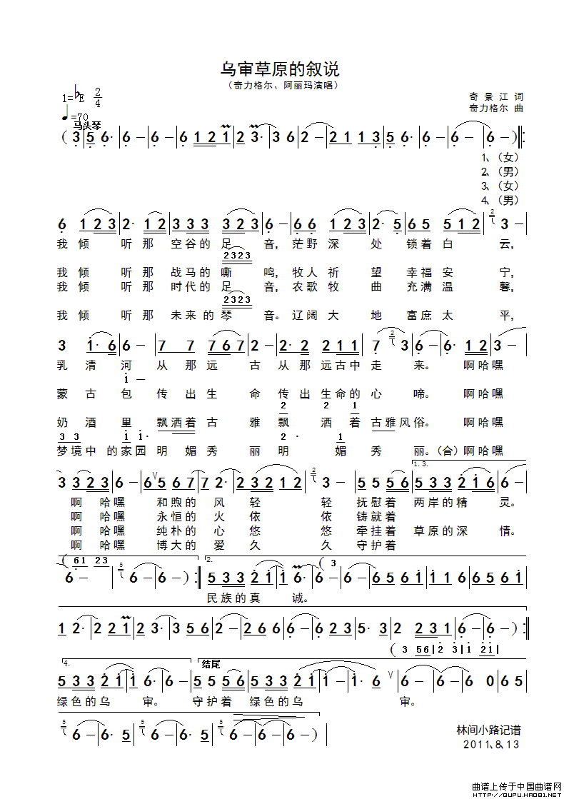 演唱(奏):奇力格尔、阿丽玛 格式:简谱 来源:林间小路 记谱 上传:~金沙浪~