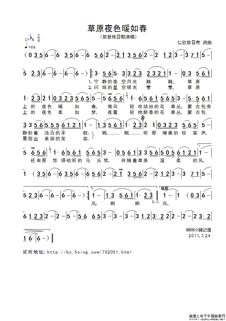 关于《草原夜色暖如春》曲谱的评论