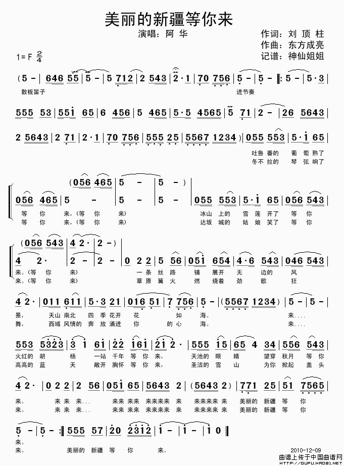 作词:刘顶柱   作曲:东方成亮   演唱(奏):阿华   格式:简谱   来源:神仙姐姐记谱   上传:神仙姐姐   日期:2012-01-03   浏览次数: