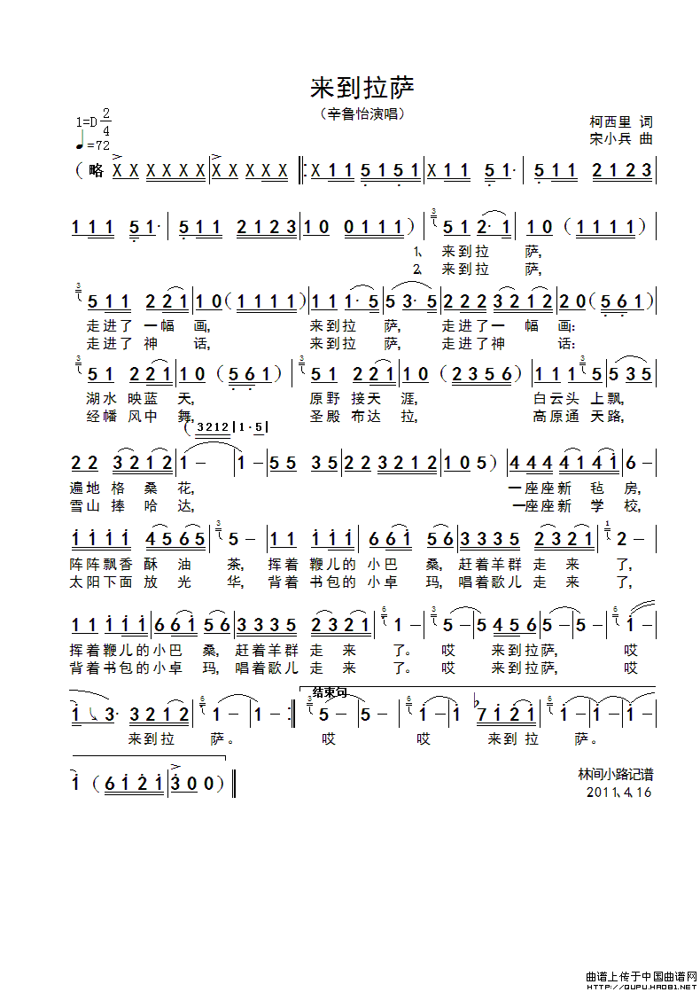 当前位置: 首页 谱友园地 谱友记谱 来到拉萨(柯西里词 宋小兵曲)
