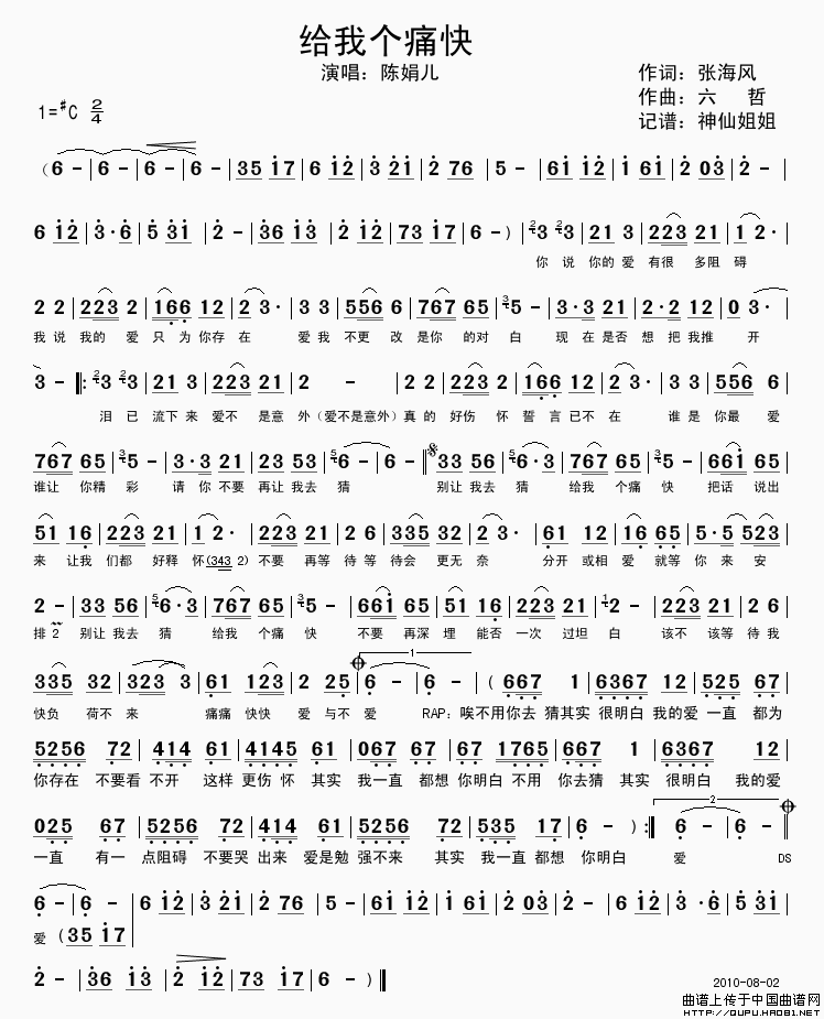 作词:张海风   作曲:六哲   演唱(奏):陈娟儿   格式:简谱   来源:神仙姐姐记谱   上传:神仙姐姐   日期:2012-01-22   浏览次数:
