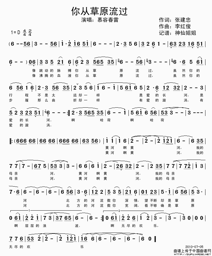 关于《你从草原流过》曲谱的评论