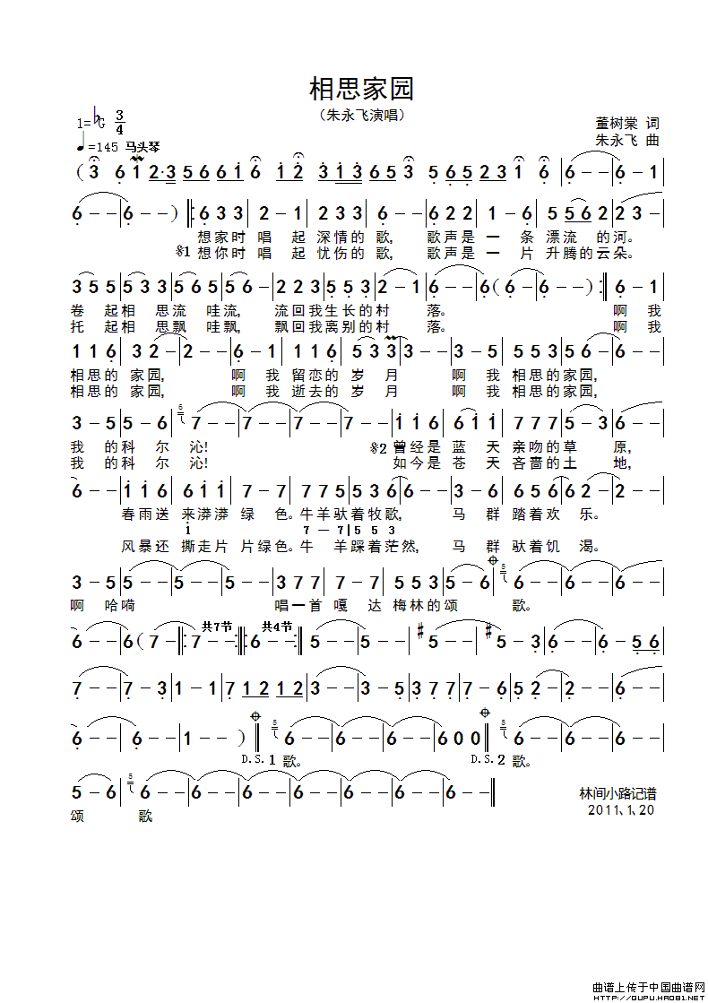 当前位置: 首页 谱友园地 谱友记谱 相思家园(朱永飞演唱版)