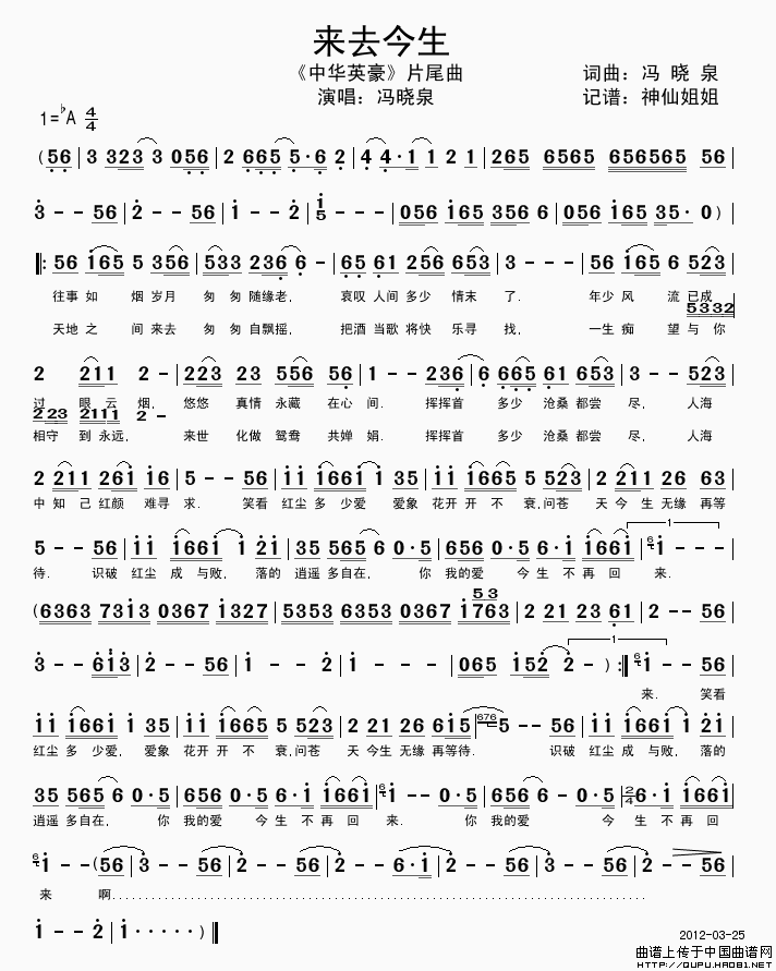 作词:冯晓泉   作曲:冯晓泉   演唱(奏):冯晓泉   格式:简谱   来源:神仙姐姐记谱   上传:神仙姐姐   日期:2012-03-28   浏览次数: