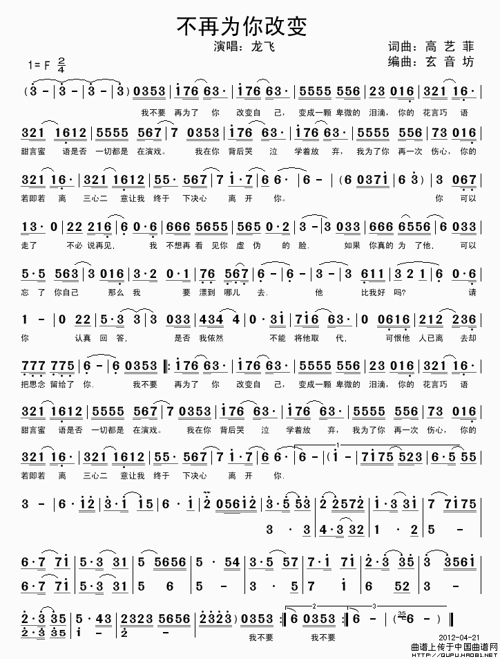 作词:高艺菲   作曲:高艺菲   演唱(奏):龙飞   格式:简谱   来源:神仙姐姐记谱   上传:神仙姐姐   日期:2012-04-24   浏览次数: