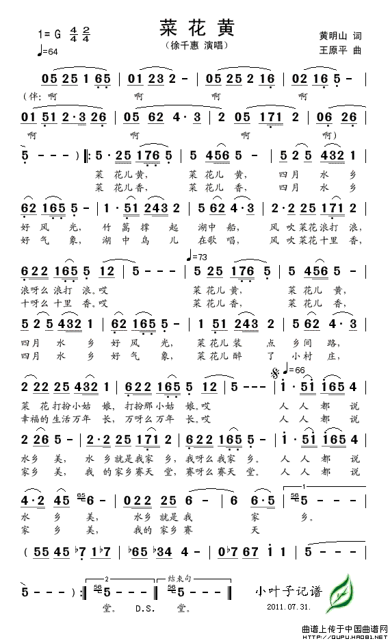 当前位置: 首页 谱友园地 谱友记谱 菜花黄(黄名山词 王原平曲)