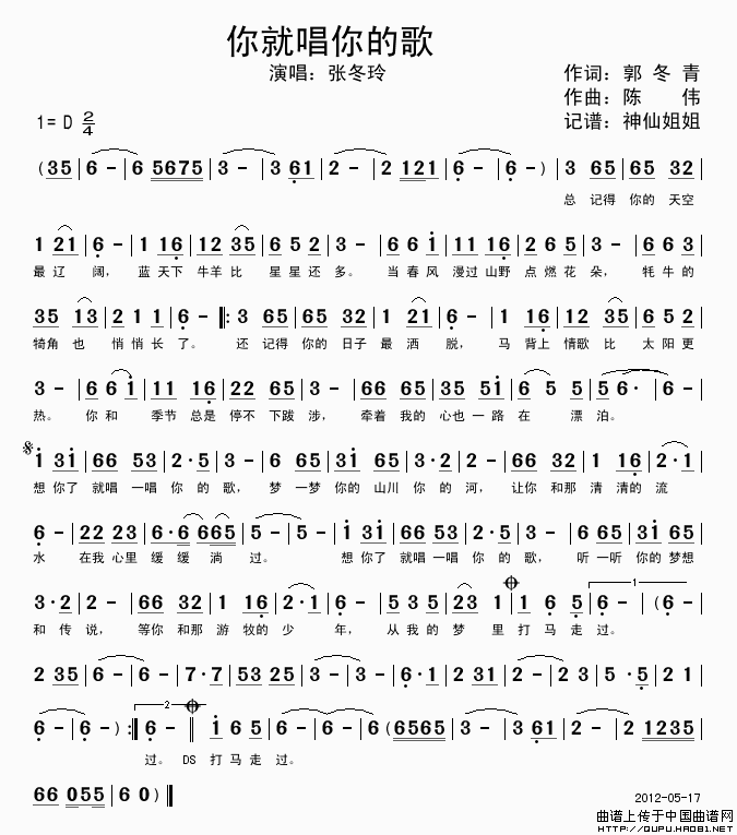 作词:郭冬青   作曲:陈伟   演唱(奏):张冬玲   格式:简谱   来源:神仙姐姐记谱   上传:神仙姐姐   日期:2012-05-18   浏览次数: