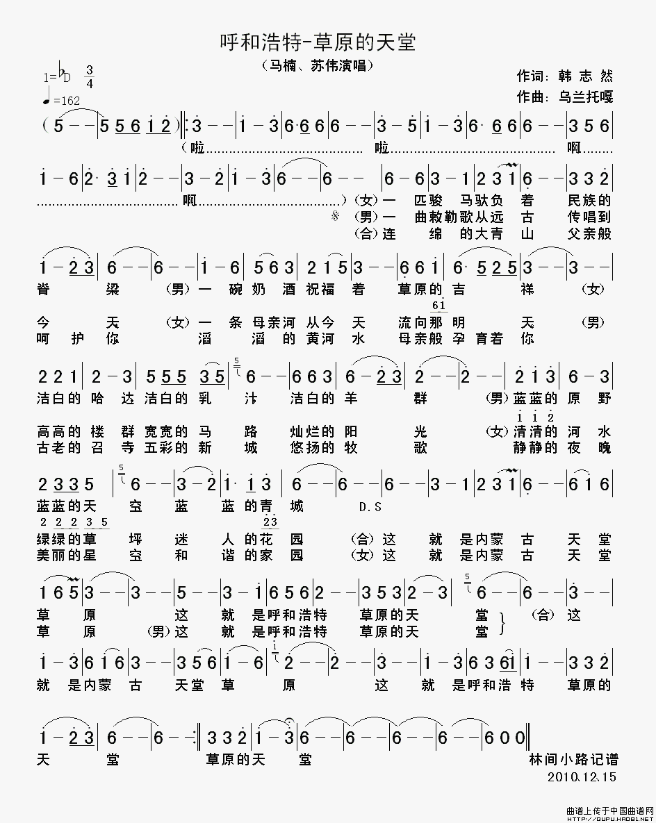 关于《呼和浩特——草原的天堂》曲谱的评论