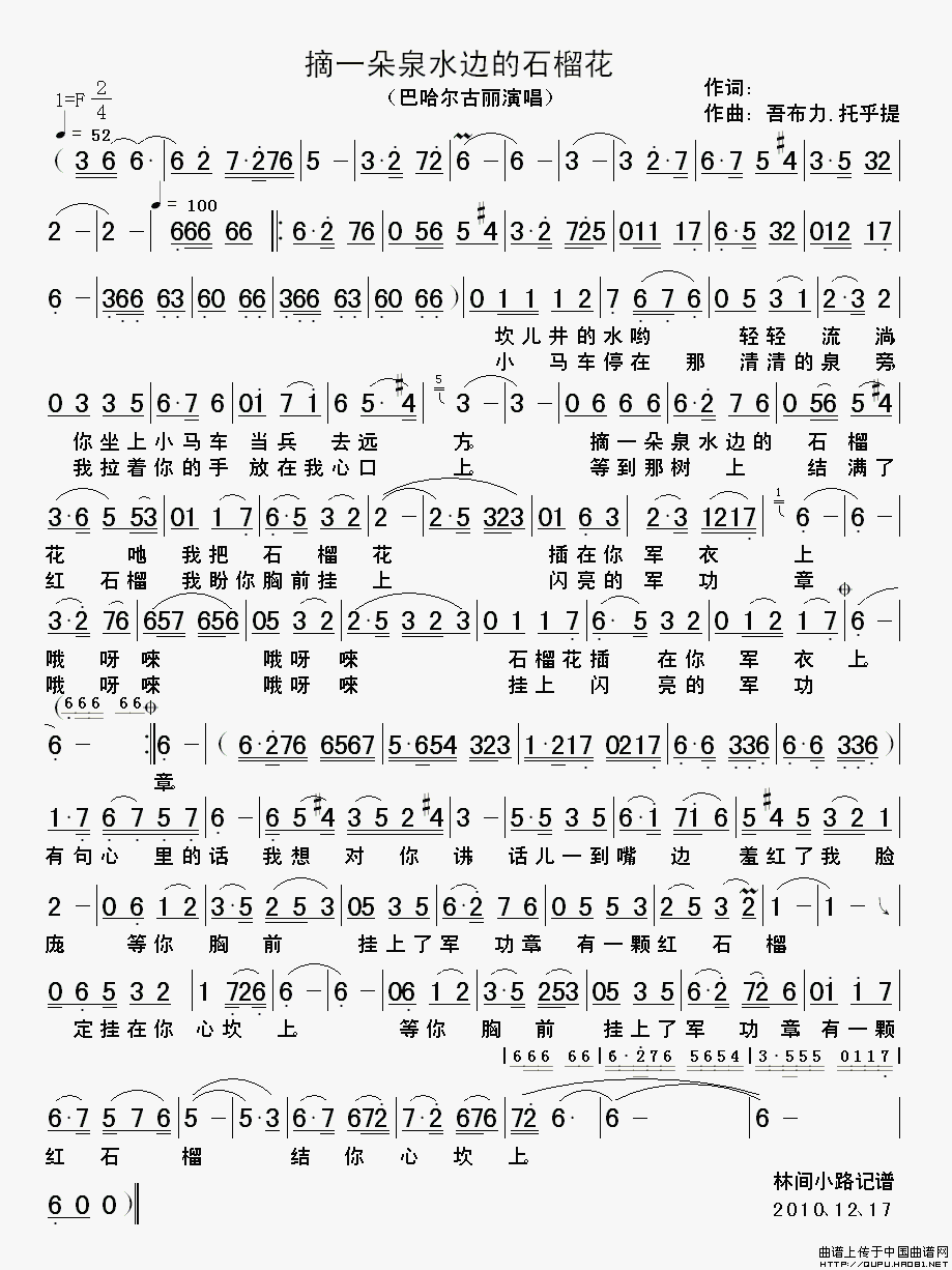 关于《摘一朵泉水边的石榴花》曲谱的评论