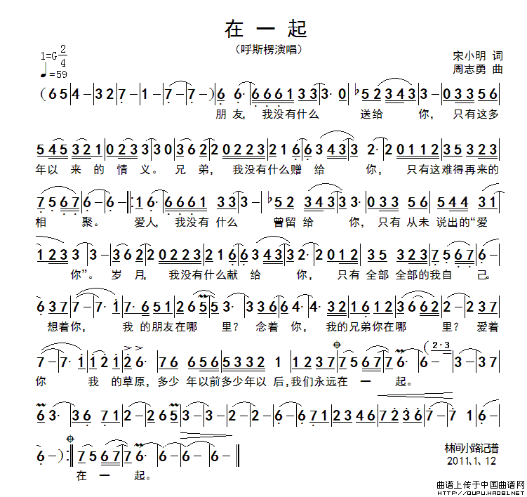 很喜欢呼斯楞的《在一起》,谢谢林间小路记谱。 [回复]