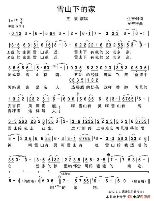 作词:生吉俐 作曲:吴宏维 演唱:王欢 我的家离雪山很近 雪山下有我的父老乡亲 阿妈说雪山有魂 五彩的经幡迎风飞舞 祈祷平安吉祥风调雨顺 呵雪山有灵呵雪山有魂 雪山陪我走红尘 远行的路上哟 难忘阿爸期待的眼神 呵雪山有灵呵雪山有魂 雪山给我透明的心 想家的梦里哟 怀念阿妈轻轻的亲吻 我的家离雪山很近 雪山下有我的父老乡亲 阿妈说客是亲人 热腾腾的奶茶这样香醇 阿爸的青稞酒这样醉人 呵雪山有灵呵雪山有魂 雪山陪我走红尘 远行的路上哟 难忘阿爸期待的眼神 呵雪山有灵呵雪山有魂, 雪山给我透明的心 想家的梦里哟 怀念阿妈轻轻的亲吻 呵雪山有灵呵雪山有魂 雪山陪我走红尘 远行的路上哟 难忘阿爸期待的眼神 呵雪山有灵呵雪山有魂, 雪山给我透明的心 想家的梦里哟 怀念阿妈轻轻的亲吻 |