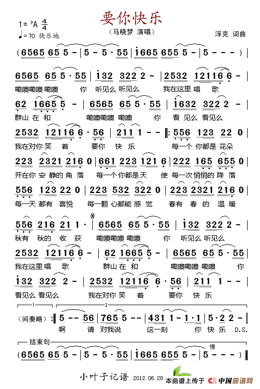 提示:在曲谱图片上单击右键,选择“图片另存为...”即可将曲谱保存到您的电脑中,打印时候可将图片插入到WORD中,调整合适大小打印即可。