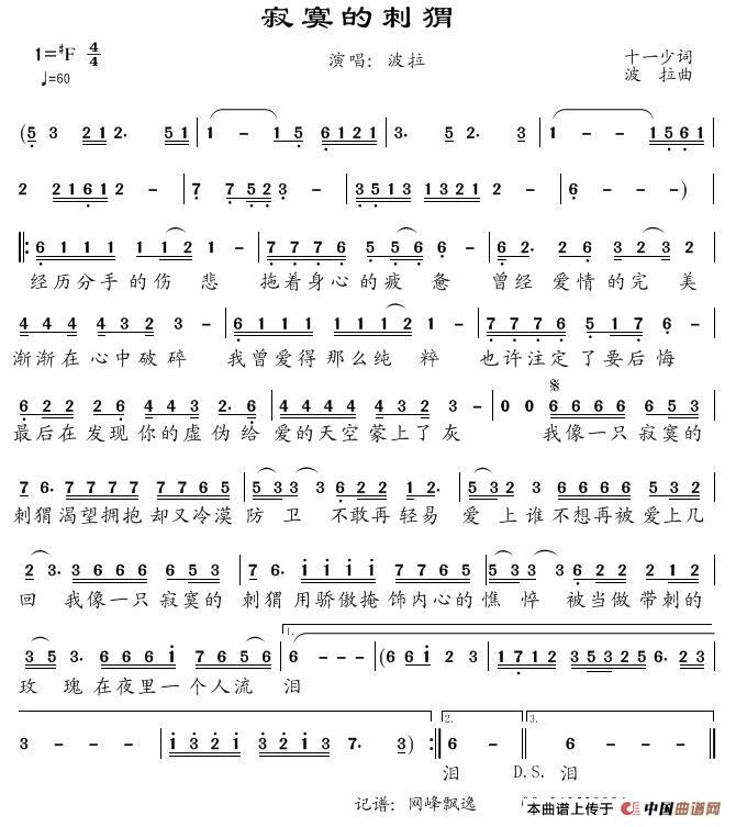 演唱:波 拉 作词:十一少 作曲:波 拉 编曲:冯 丹 后期:周晓明 经历分手的伤悲 拖着身心的疲惫 曾经爱情的完美 渐渐在心中破碎 我曾爱得那么纯粹 也许注定了要后悔 最后才发现你的虚伪 给爱的天空蒙上了灰 我像一只寂寞的刺猬 渴望拥抱却又冷漠防卫 不敢再轻易爱上谁 不想再被爱伤几回 我像一只寂寞的刺猬 用骄傲掩饰内心的憔悴 被当做带刺的玫瑰 在夜里一个人流泪 |