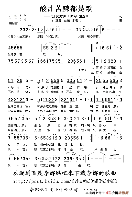 演唱(奏):韩磊、李娜 格式:简谱 来源:小叶子记谱 上传:~金沙浪~