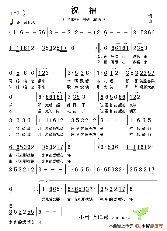 演唱(奏):金顺姬、扑燕 格式:简谱 来源:小叶子记谱 上传:~金沙浪~
