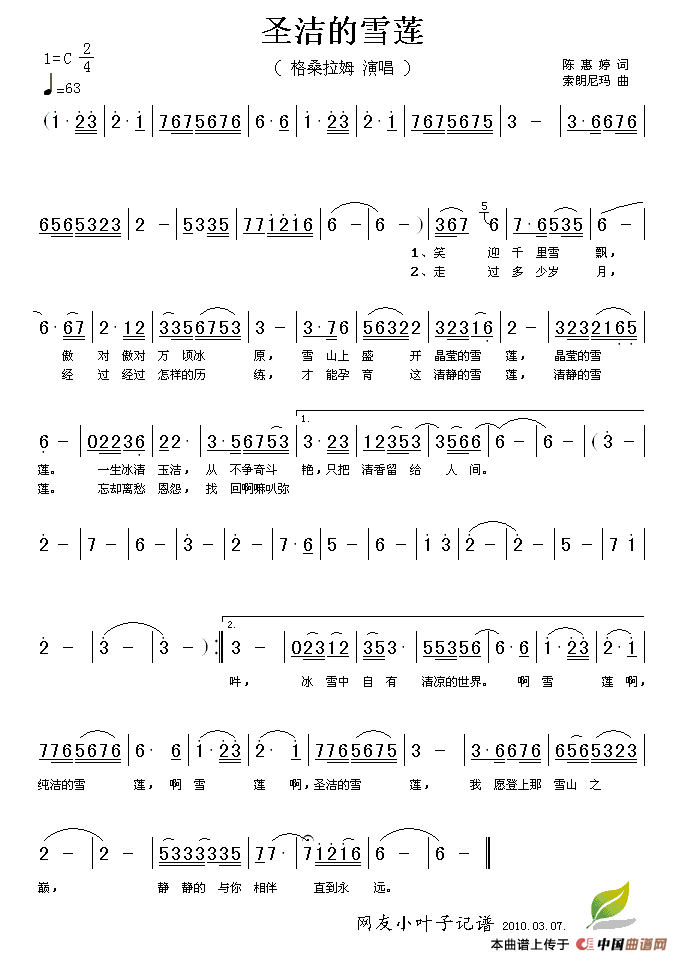 当前位置: 首页 谱友园地 谱友记谱 圣洁的雪莲(陈慧婷词 索朗尼玛曲)