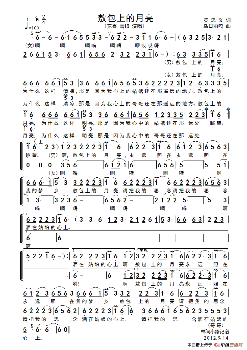 罗忠义 敖包上的月亮, 为什么这样清凉, 那是因为我心上的姑娘(哥哥), 还在那遥远的地方。 敖包上的月亮, 为什么这样明亮, 那是因为我心中的姑娘(哥哥), 还在那远处眺望 啊,敖包上的月亮, 永远照在我的梦乡, 啊,敖包上的月亮, 请把我的思念洒在姑娘(哥哥)的心上。 |