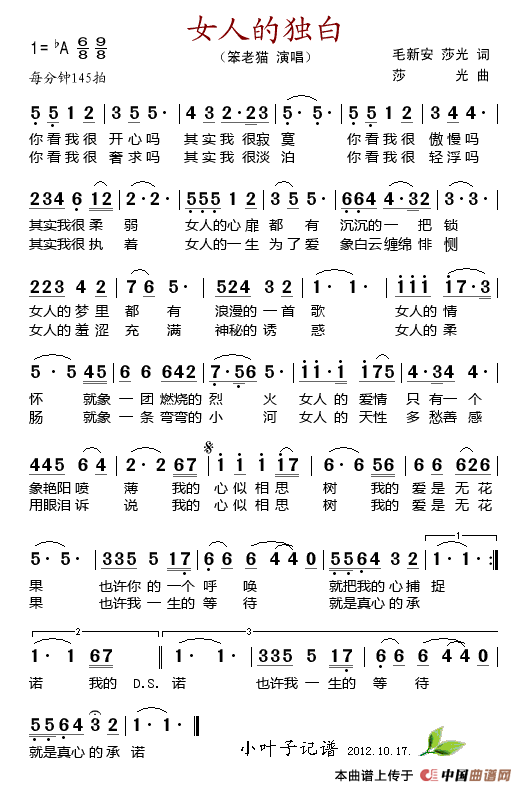 演唱(奏):笨老猫 格式:简谱 来源:小叶子记谱 上传:~金沙浪~