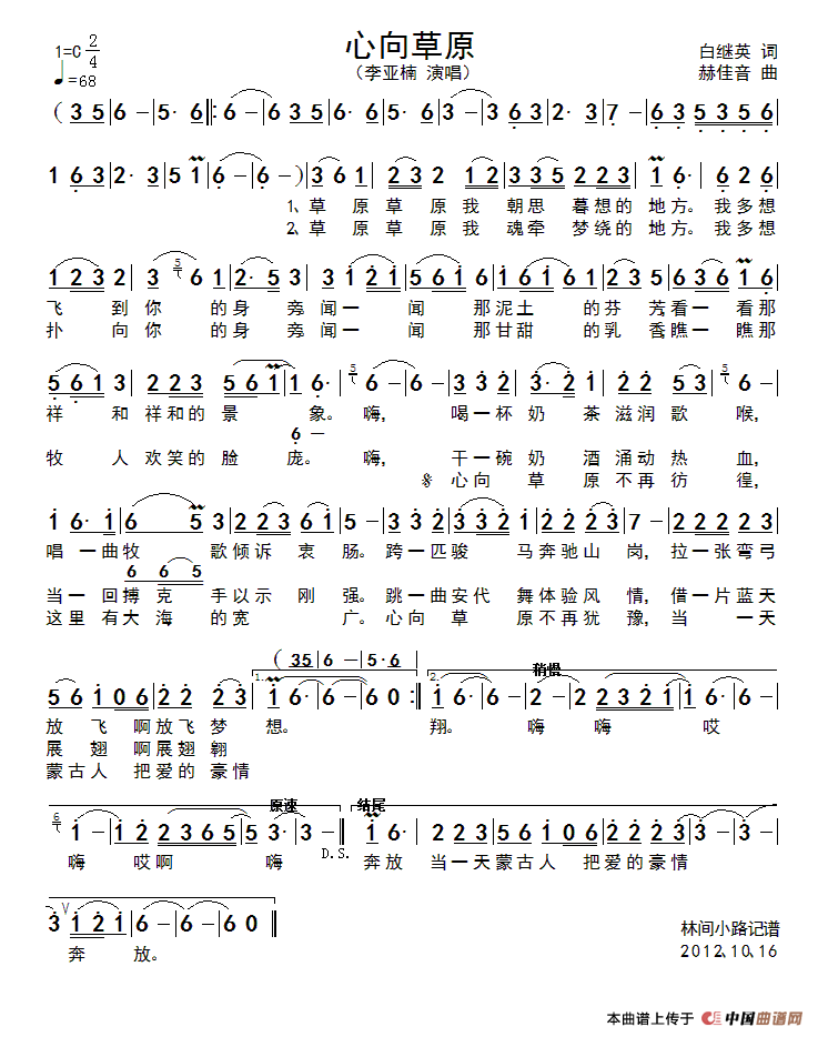 我多想,飞到你的身旁。 闻一闻那泥土的芬芳, 看一看那祥和的景象。 喝一杯奶茶滋润歌喉, 唱一曲牧歌倾诉衷肠。 跨一匹骏马奔驰山岗, 拉一张弯弓放飞梦想。 草原草原,我魂牵梦绕的地方, 我多想,踏上你的牧场, 闻一闻那甘甜的乳香。 瞧一瞧那牧人欢笑的脸庞。 干一碗奶酒涌动热血, 当一回博克手比试刚强。 跳一曲安代舞体验风情, 借一片蓝天展翅翱翔。 哎啊哈嗬,哎啊哈嗬, 心向草原,不再彷徨, 这里有大海的宽广。 心向草原,不再犹豫, 当一天蒙古人,把爱的豪情奔放。 当一天蒙古人,把爱的豪情奔放。 |