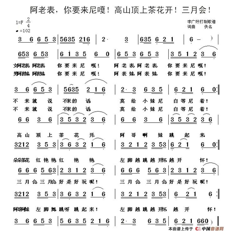 关于《阿老表,啊表妹,你要来尼嘎,茶花开,三月会》曲谱的评论