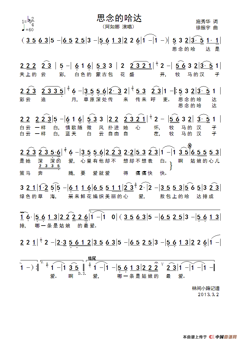 关于《思念的哈达》曲谱的评论