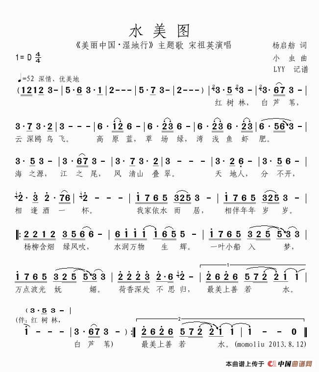 中文国际频道《走遍中国》栏目制作50集大型系列片《美丽中国 湿地行》主题歌,由中央电视台主办的2013年大型公益活动《美丽中国 湿地行》形象大使宋祖英演唱。