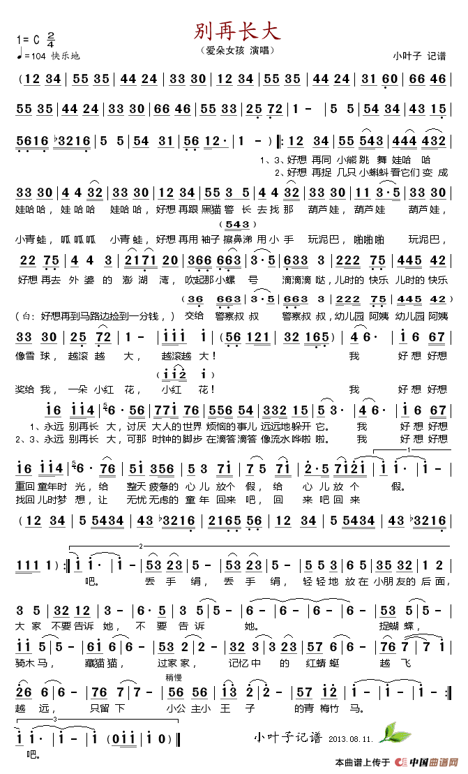 关于《别再长大》曲谱的评论