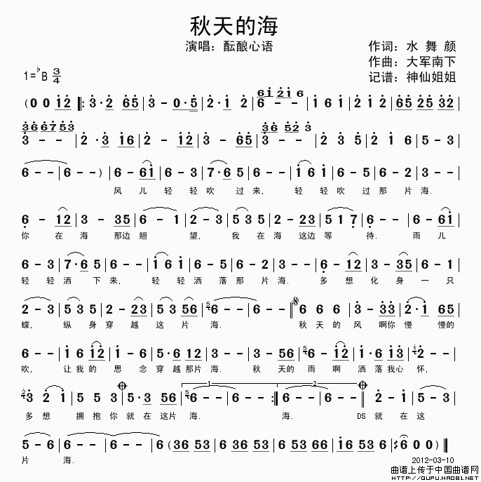 作词:水舞颜   作曲:大军南下   演唱(奏):酝酿心语   格式:简谱   来源:神仙姐姐记谱   上传:神仙姐姐   日期:2012-03-11   浏览次数: