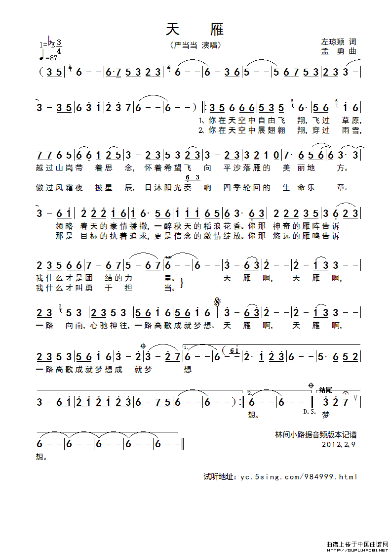关于《天雁》曲谱的评论