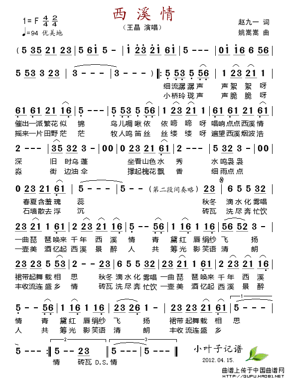 作词:赵九一 作曲:姚嵩嵩 演唱(奏):王晶 格式:简谱 来源:小叶子记谱 上传:~金沙浪~
