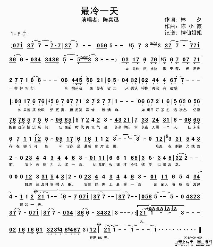 作词:林夕   作曲:陈小霞   演唱(奏):陈奕迅   格式:简谱   来源:神仙姐姐记谱   上传:神仙姐姐   日期:2012-04-04   浏览次数: