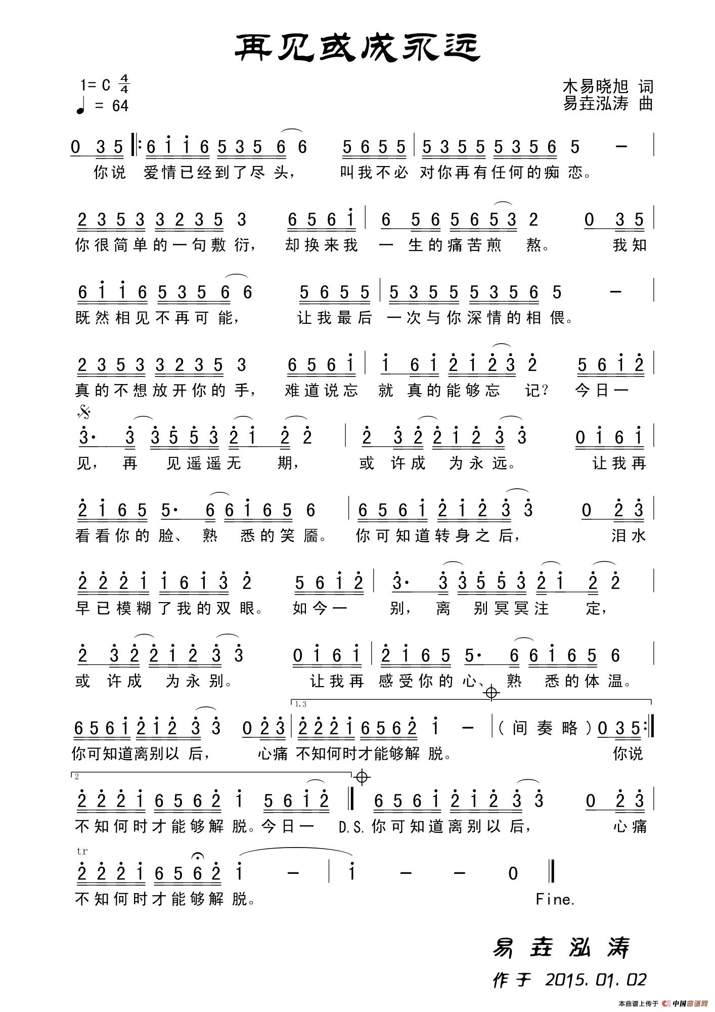 关于《再见或成永远》曲谱的评论