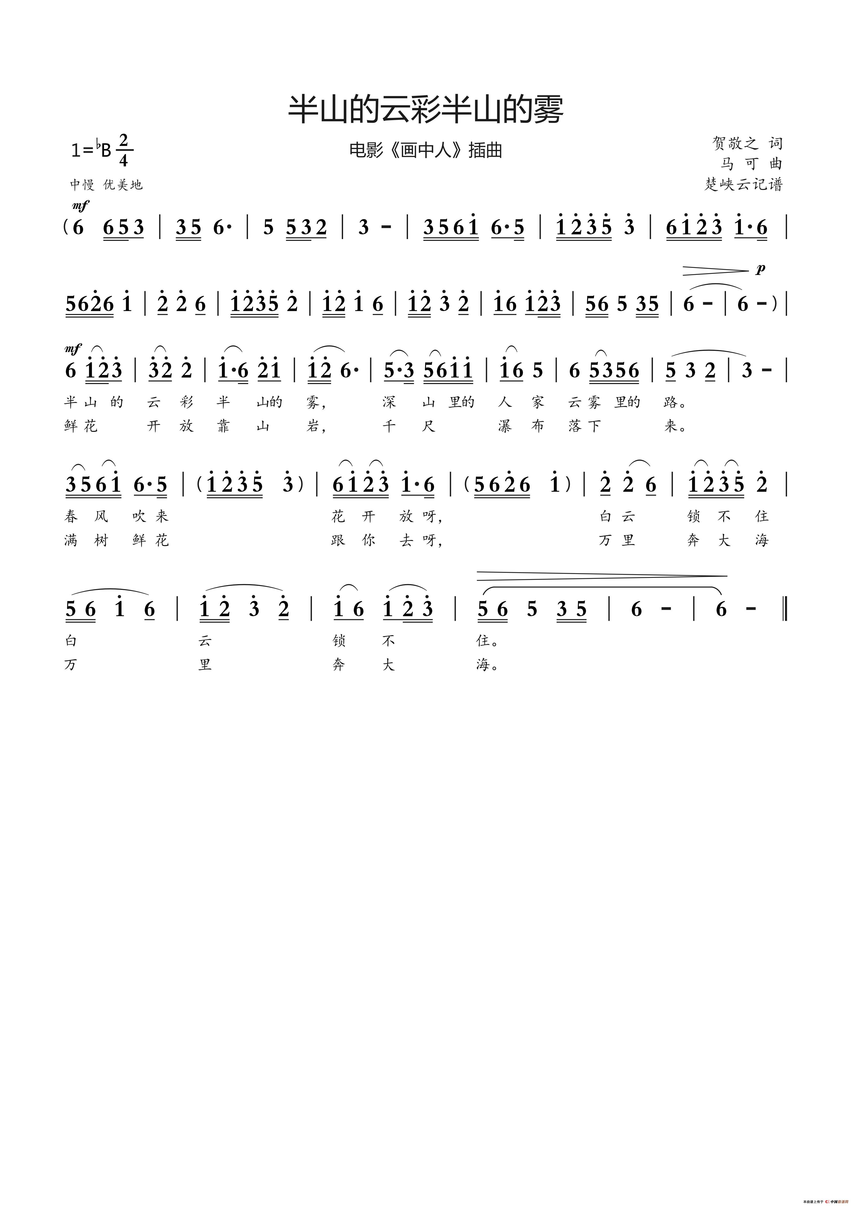 从今日始,我将以“楚峡云”的笔名开始记谱上传一些我年轻时难忘的经典电影插曲,譬如今天上传的这首《半山的云彩半山的雾》,词曲皆出自名家之手。影片中的插曲由女主角李忆兰演唱。歌词请新、自然,毫无雕琢之气,旋律优美流畅,易学易记。应该说我的作曲也深受这些经典之作的启发和影响,受用是终身的!作品的示笵作用是永恒的!