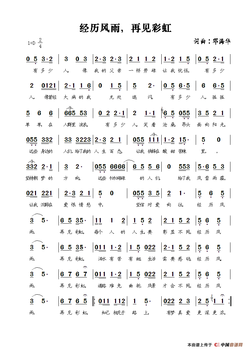 发表在国家级音乐杂志《中国乐坛》等处。邓海华词曲的励志歌曲《飞越彩虹,共同的梦》(青奥会获奖歌曲)姊妹篇,《飞》写的是体赛的励志、《经》是生活的励志,后者是得青奥会获奖消息后,心潮澎湃写的。