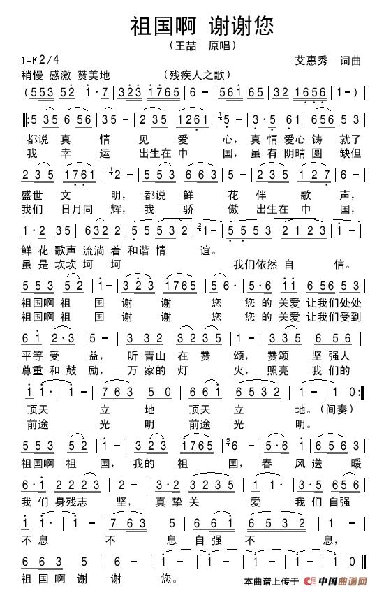 关于《祖国啊 谢谢您(艾惠秀 词曲》曲谱的评论