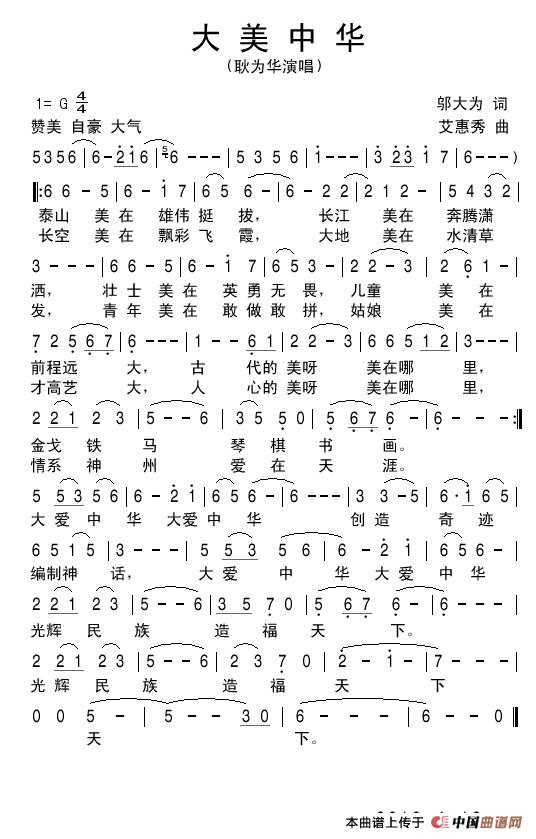 关于《大美中华(邬大为词 艾惠秀曲)》曲谱的评论