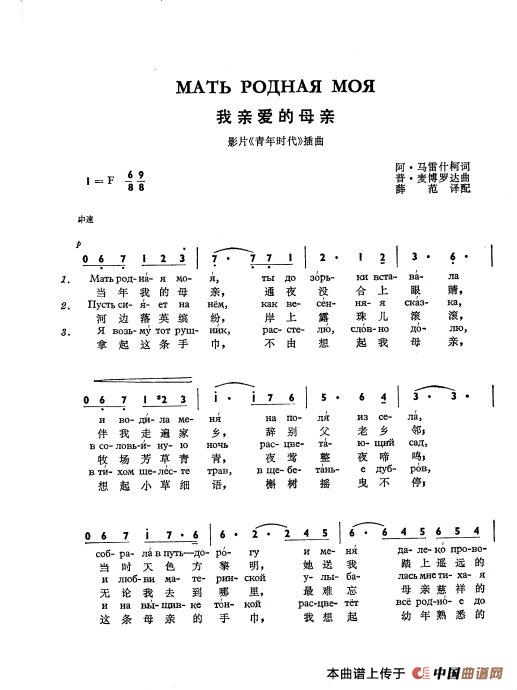 我亲爱的母亲Мать родная моя(中俄简谱)