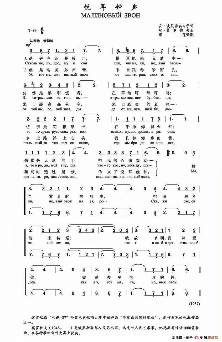 悦耳钟声МАЛИНОВЫЙ ЗВОН国(中俄简谱)