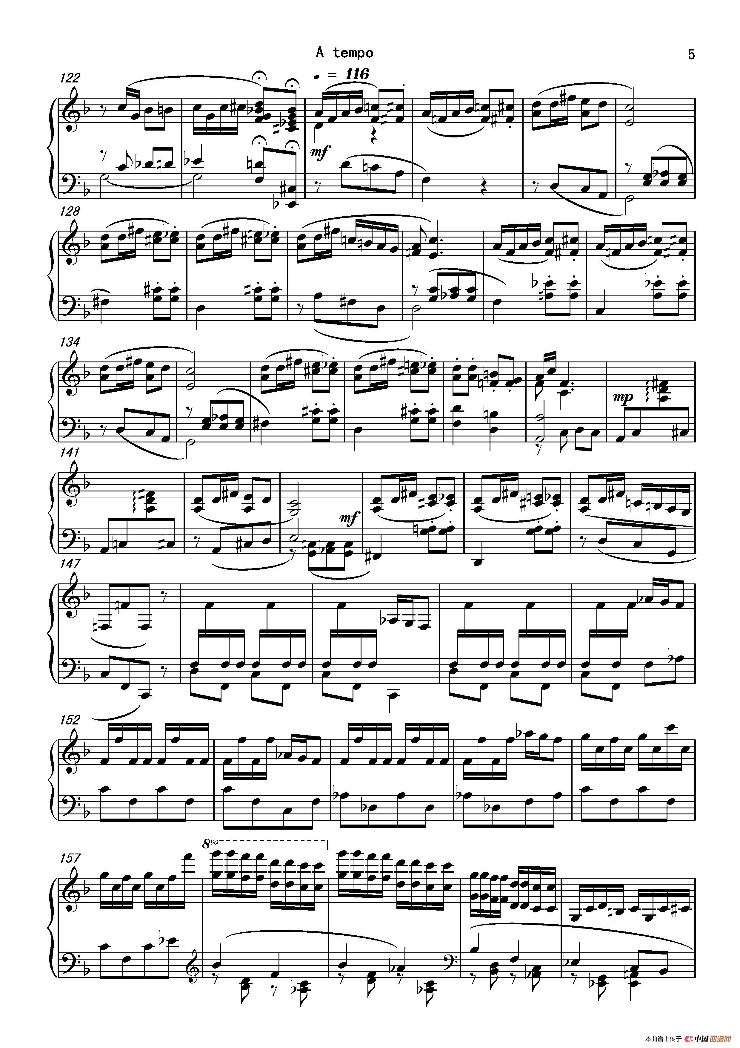 第一乐章 奏鸣曲式呈示部主部主题:《第一钢琴奏鸣曲》第一乐章奏鸣曲式呈示部主部主题,运用了作者儿时母亲所唱的《哭嫁歌》做素材,表达作者对人生的思考及对岁月的怀恋。主部主题通过简短的连接部的变奏、分裂、渲染、音乐形象逐渐开朗,连接部短促跳跃的音型牵带出调皮的副部主题。这段音乐分为三个层次,高音部两个层次由切分节奏与中音部八方音符结合成摇曳的曲调,低音部织体是行走、自我放荡式的形态,犹如放学路上戏耍、淘气的顽童、以及田野中蹦跳的乡村牧童展开部变奏的尾声部分,作者在第一乐章的第176—184小节以主部主题在不同调性上的呈现设计了假再现段落,使音乐在187小节自然的承接到再现部。主、副部主题的调性统一回归到C大调,传统的再现部表达了作者对古典作曲家的由衷敬意!