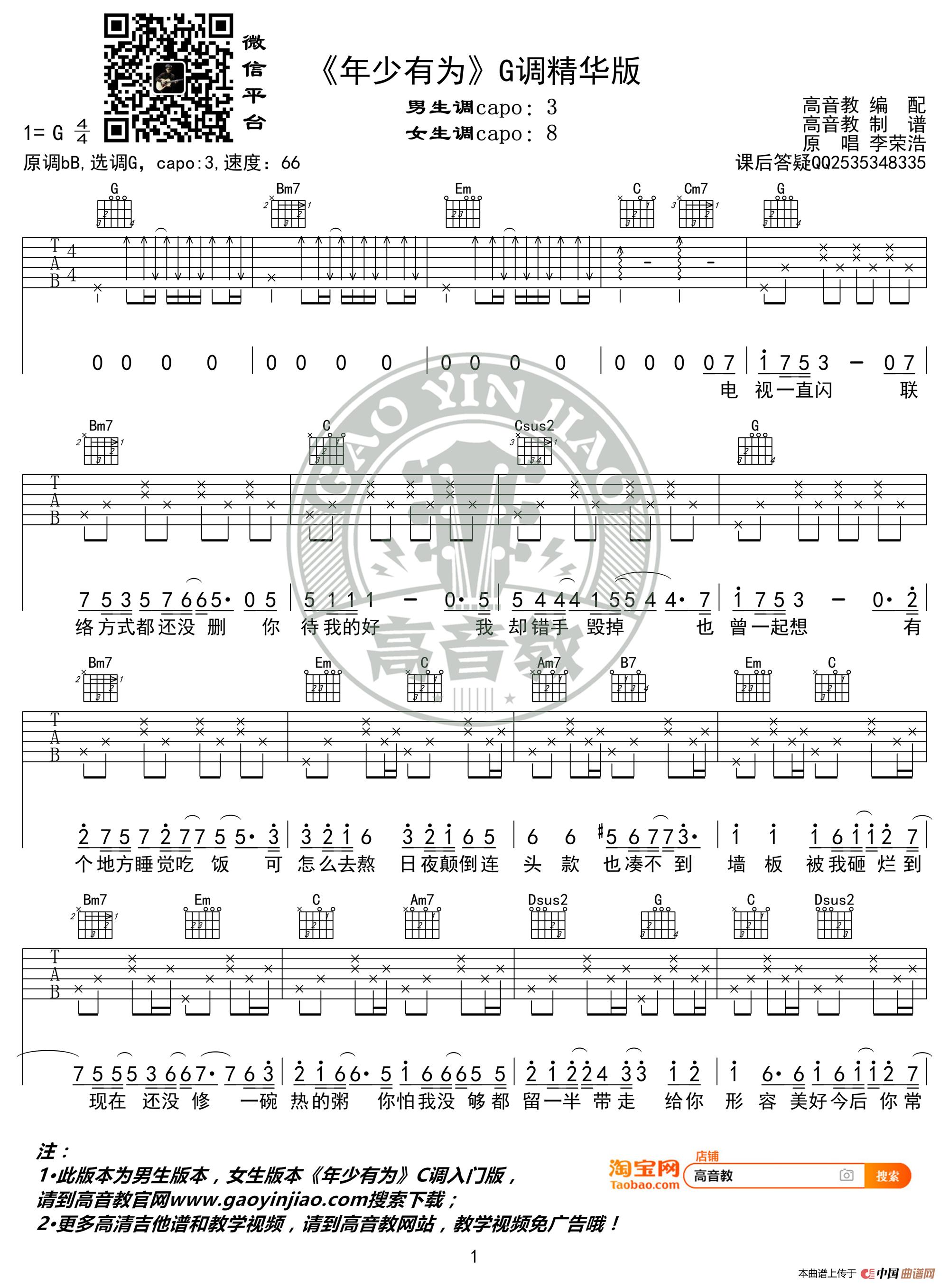 《年少有为》吉他谱G调精华版 李荣浩 高音教编配
