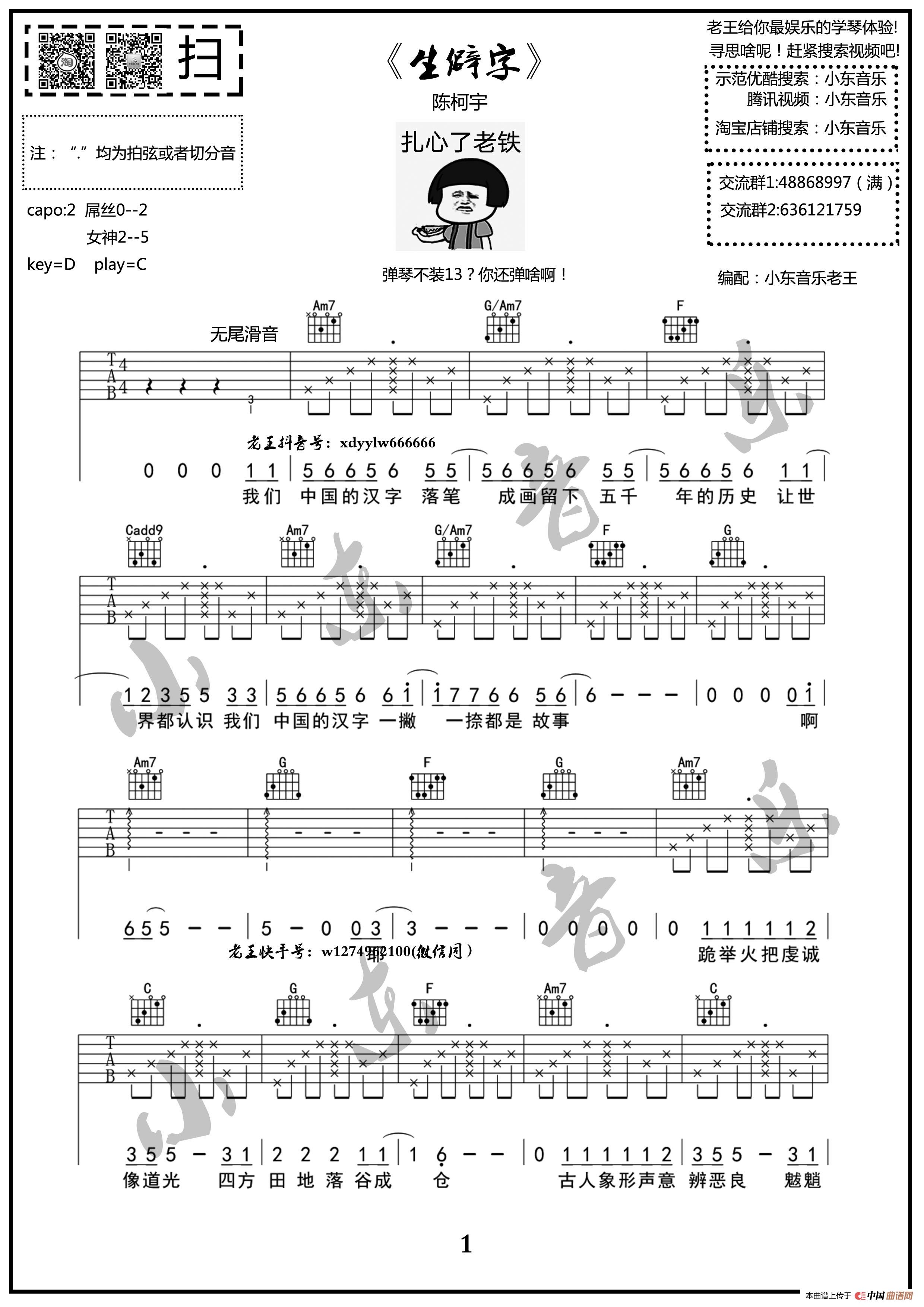 《生僻字》陈柯宇原版吉他谱小东音乐老王编配全网首发