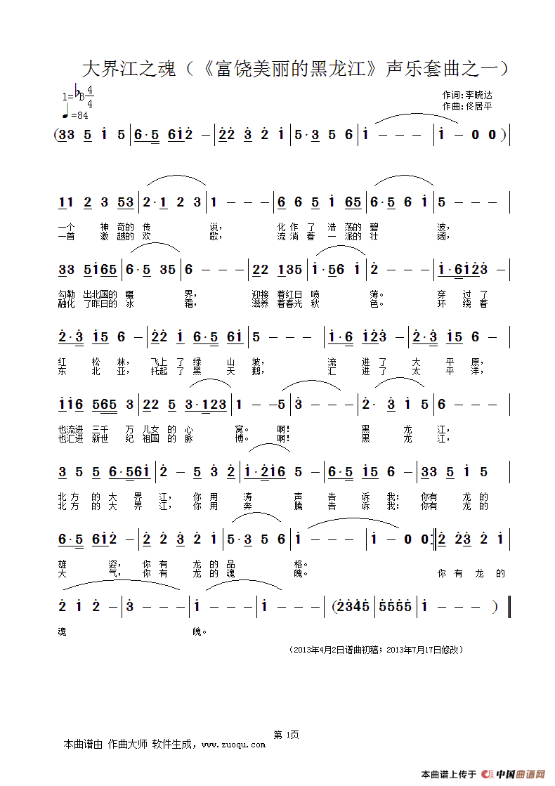 (2013年4月2日曲谱初稿, 2013年7月17日定稿,2018年12月重新编曲)
