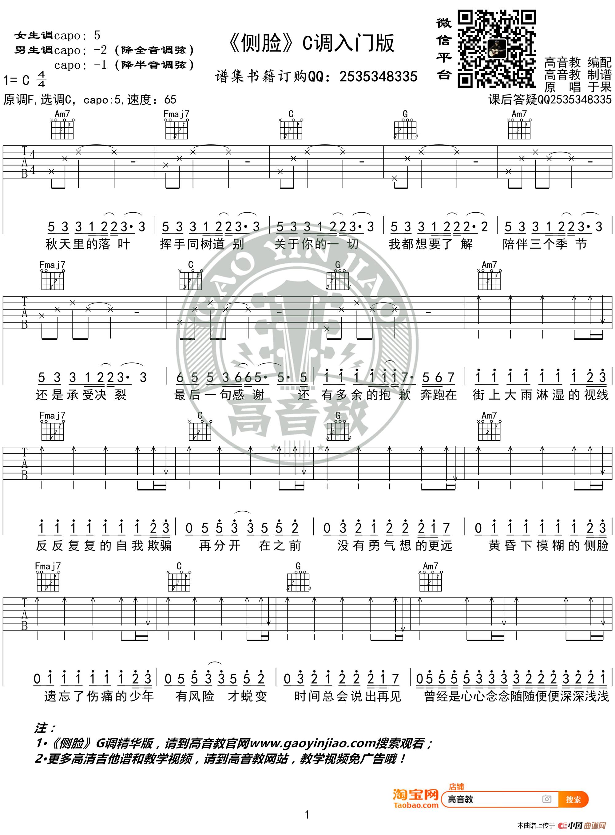 入门版《侧脸》吉他谱C调 于果 高音教编配