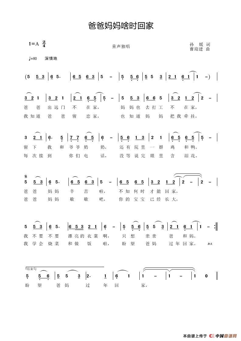 关于《爸爸妈妈啥时回家》曲谱的评论
