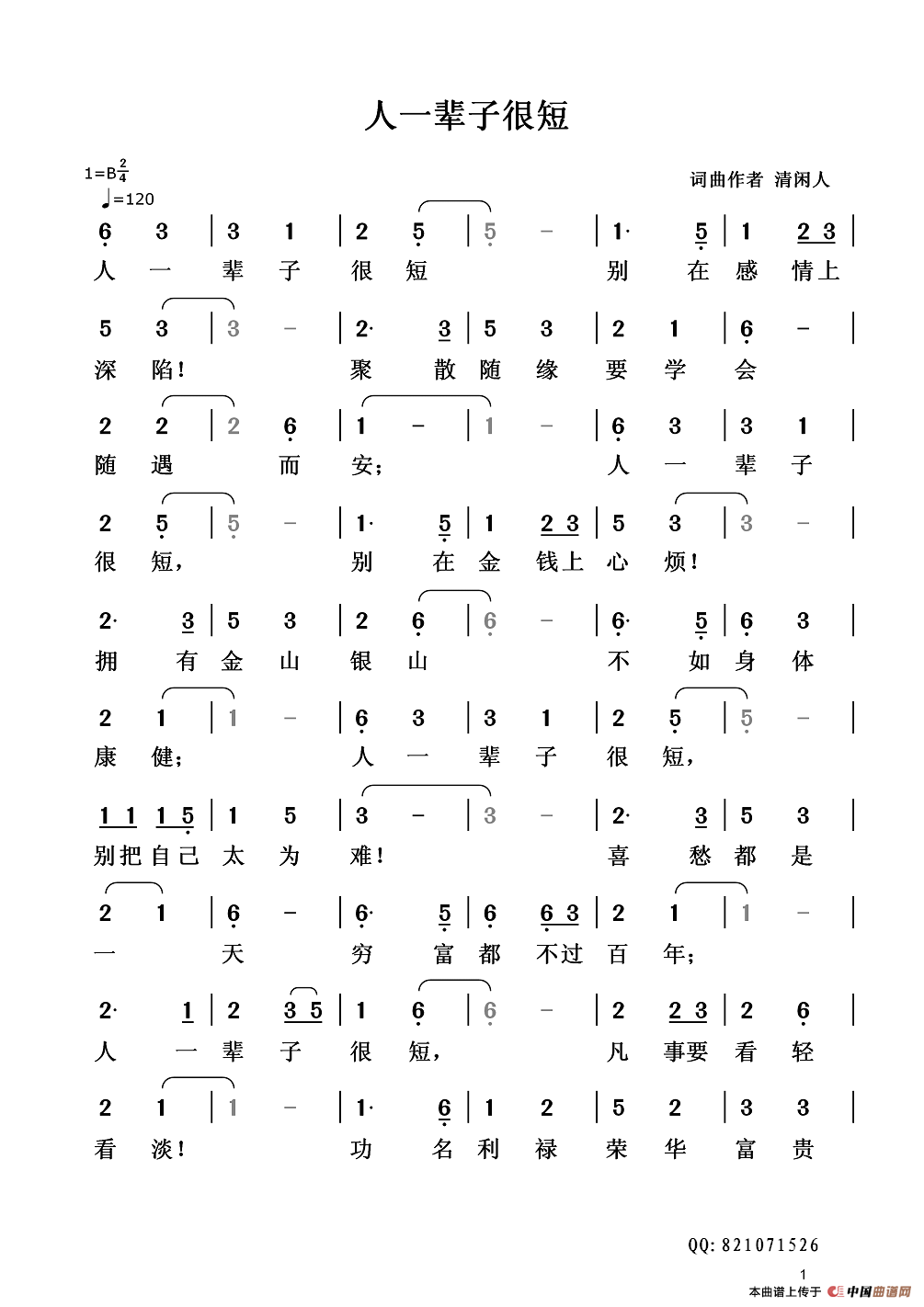 人一辈子很短,别在感情上深陷!聚散随缘要学会随遇而安;人一辈子很短,别在金钱上心烦!拥有金山银山不如身体康健;人一辈子很短,别把自己太为难!喜愁都是一天穷富都不过百年;人一辈子很短,凡事要看轻看淡!功名利禄荣华富贵过后皆成云烟。人一辈子很短,别领悟的太晚!自己要活的好点,父母要孝敬当前,儿孙别管的太宽,夫妻要体贴温暖,朋友要侠肝义胆,下辈子不可能遇见。