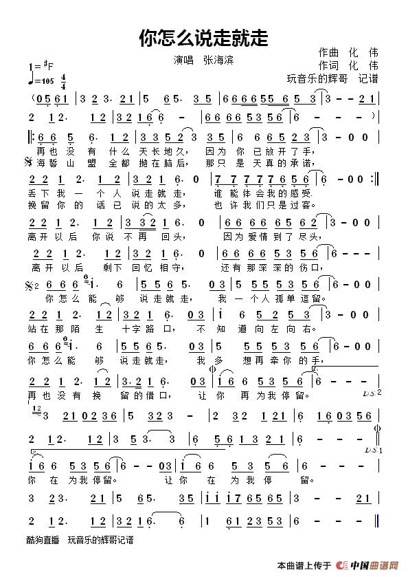 作词:作 词 化 伟 作曲:作 曲 化 伟 演唱(奏):演唱 张海滨 来源:根据张海滨演唱记谱 上传:玩音乐的辉哥