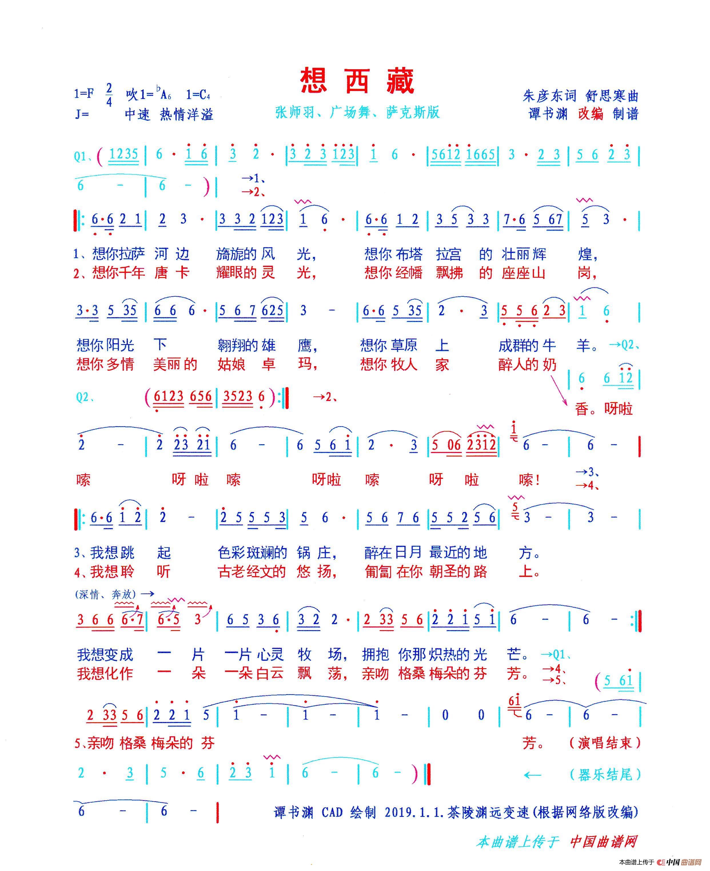 标有“上传于中国曲谱网”的“想西藏”最后满意的彩谱,已经上传。恳请配上——张师羽、广场舞版本的配套“试听”!等待、恭候、分享您的劳动成果——视听效果显著的、更新的“想西藏”彩谱!谢谢!学生谭