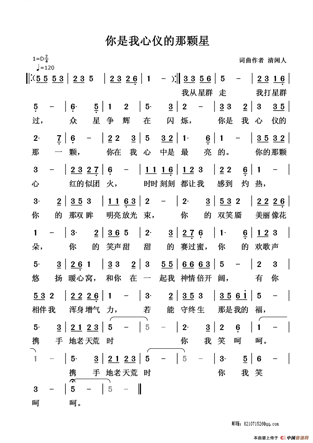 我从星群走我打星群过,众星争辉在闪烁,你是我心仪的那一颗,你在我心中是最亮的。你的那颗心红的似团火,时时刻刻都让我感到灼热,你的那双眸明亮放光束,你的双笑靥美丽像花朵,你的笑声甜甜的赛过蜜,你的欢歌声悠扬暖心窝,和你在一起我神情倍开阔,有你相伴我浑身增气力,若能守终生那是我的福,携手地老天荒时你我笑呵呵。